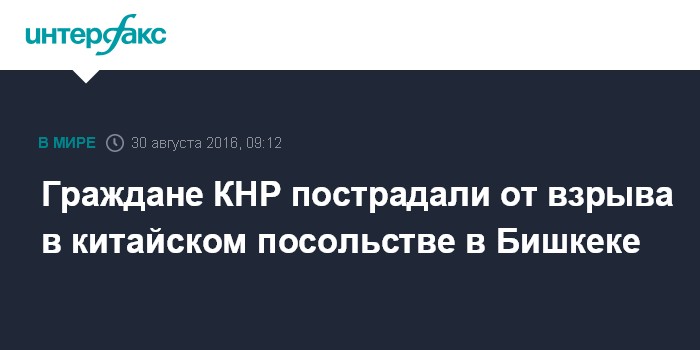 Москва. 30 августа. INTERFAX.RU - Сотрудники китайского посольства в столице Киргизии Бишкеке и члены их семей пострадали в результате взрыва на территории диппредставительства, сообщило центральное телевидение Китая.