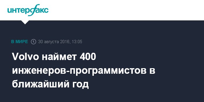 Москва. 30 августа. INTERFAX.RU - Шведский производитель автомобилей класса "премиум" Volvo Cars Corporation, владельцем которого является китайский концерн Geely, планирует нанять около 400 инженеров-программистов на следующий год для разработки систем безопасности, автономного вождения и электромобилей.