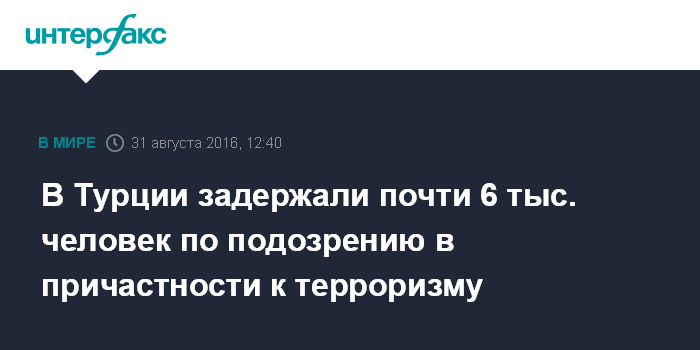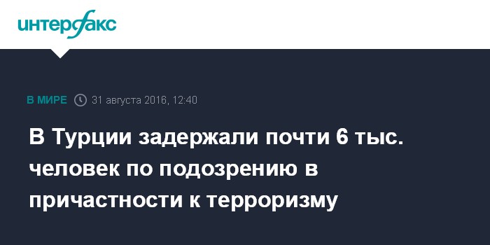 Москва. 31 августа. INTERFAX.RU - Власти Турции задержали 5,803 человека, по подозрению в причастности к террористической деятельности, сообщил в среду глава МВД Турции Эфкан Ала. Из них порядка 2,200 - иностранцы.