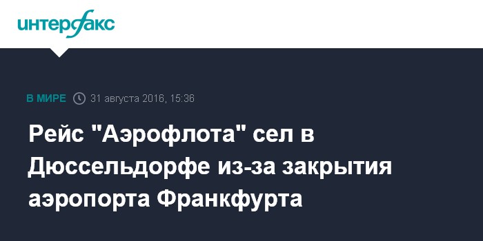 Москва. 31 августа. INTERFAX.RU - Рейс авиакомпании "Аэрофлот" Москва - Франкфурт приземлился в Дюссельдорфе из-за закрытия аэропорта Франкфурта, говорится в сообщении авиакомпании.