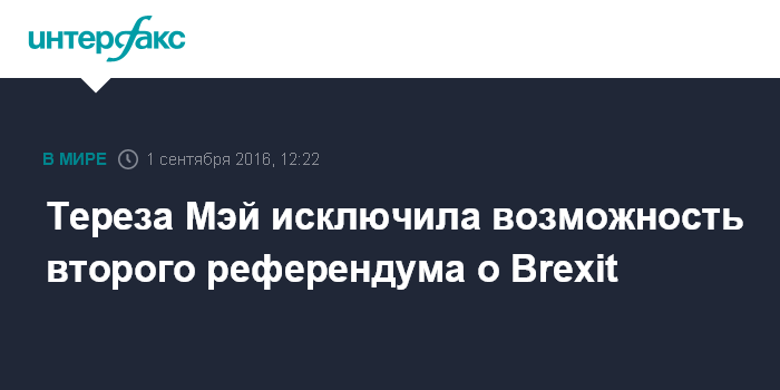Москва. 1 сентября. INTERFAX.RU - Никакого повторного референдума по вопросу выхода Великобритании из состава Европейского союза (Brexit) не будет, заявила премьер-министр Великобритании Тереза Мэй на встрече с министрами.