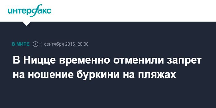 Москва. 1 сентября. INTERFAX.RU - Суд Ниццы временно снял введенный ранее запрет на ношение на пляжах города буркини - купального костюма для мусульманок, полностью закрывающего тело, сообщают в четверг французские СМИ.