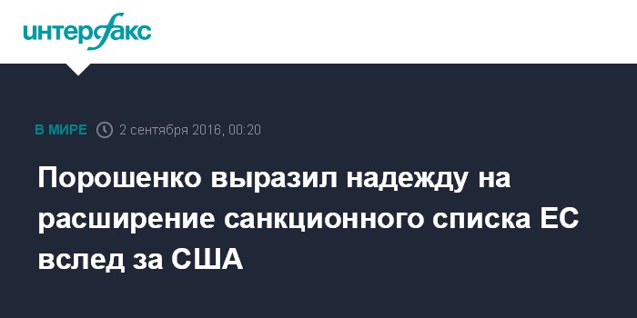 Москва. 2 сентября. INTERFAX.RU - Президент Украины Петр Порошенко выразил надежду, что Евросоюз вслед за США может расширить санкционный список против ряда российских физлиц и компаний.