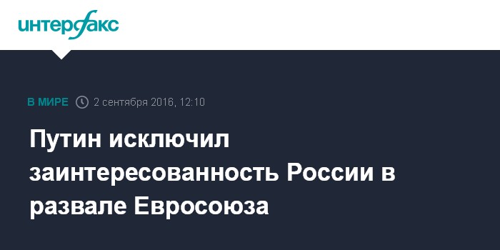 Москва. 2 сентября. INTERFAX.RU - Президент РФ Владимир Путин назвал провокационным вопрос о возможности сокращения числа членов Евросоюза после Вrexit, но не исключил такого развития событий.