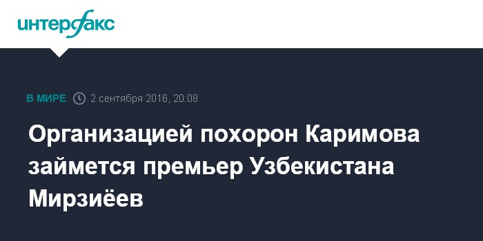 Президент Узбекистана Каримов скончался в пятницу после перенесенного в минувшую субботу инсульта. Похороны пройдут в субботу 3 сентября в Самарканде. Каримова похоронят на кладбище Самарканда, которое находится вблизи от исторического памятника Шахи Зинда, где похоронены его родные, отмечается в сообщении.