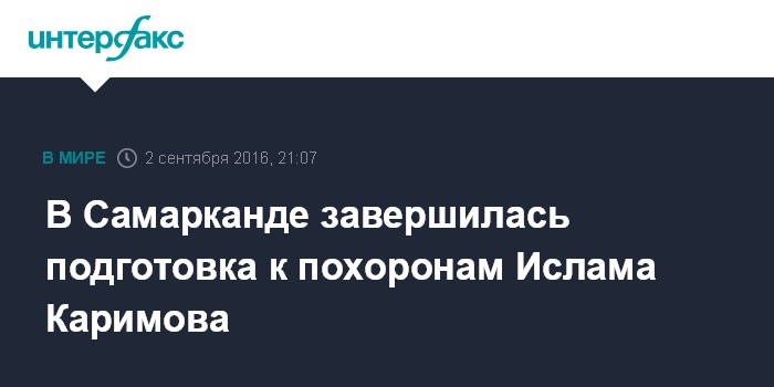 "В 9:00 по местному времени в субботу планируется официальная церемония прощания с президентом в Самарканде, на площади близ исторического памятника Шахи Зинда. Рядом расположено кладбище, где похоронены родные президента", - заявил "Интерфаксу" источник в администрации города.