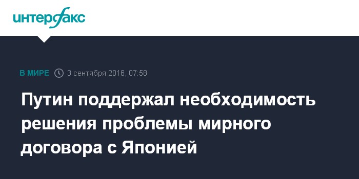 Москва. 3 сентября. INTERFAX.RU - Президент России Владимир Путин заявил о необходимости решить проблему мирного договора с Японией.