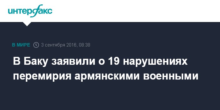 Москва. 3 сентября. INTERFAX.RU - Вооруженные силы Армении нарушили за минувшие сутки режим прекращения огня на линии соприкосновения азербайджанских и армянских вооруженных сил 19 раз, сообщает пресс-служба министерства обороны Азербайджана.