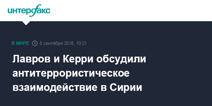 Москва. 5 сентября. INTERFAX.RU - Глава МИД РФ Сергей Лавров и госсекретарь США Джон Керри обсудили в ходе саммита G20 в Ханьчжоу механизмы взаимодействия Москвы и Вашингтона в борьбе с терроризмом в Сирии.