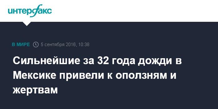 Москва. 5 сентября. INTERFAX.RU - Ливни, обрушившиеся на южные районы Мексики, стали причиной сильных наводнений, в результате которых погибли не менее трех человек, сообщают в понедельник западные СМИ со ссылкой на местные власти.