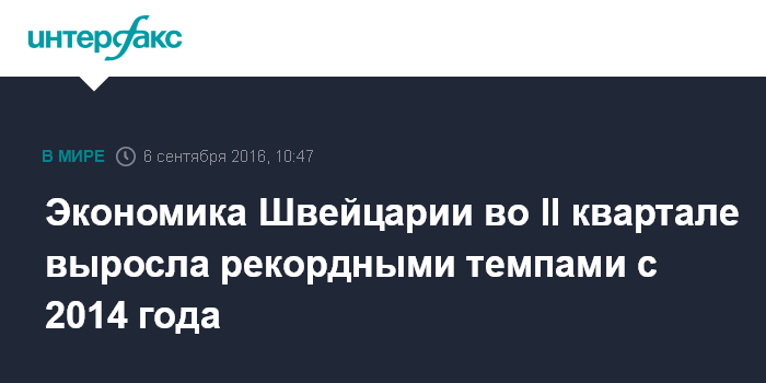 Москва. 6 сентября. INTERFAX.RU - Экономика Швейцарии выросла на 0,6% во втором квартале 2016 года по сравнению с предыдущим кварталом и на 2% в годовом выражении, продемонстрировав самые высокие темпы роста с 2014 года, свидетельствуют данные Государственного секретариата по экономике Швейцарии (SECO).