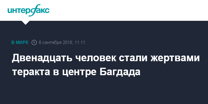 Москва. 6 сентября. INTERFAX.RU - Не менее 12 человек погибли, еще 28 человек получили ранения при взрыве автомобиля в центре Багдада, сообщает во вторник агентство The Associated Press..