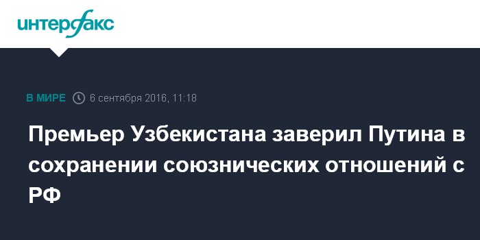 Москва. 6 сентября. INTERFAX.RU - Для Узбекистана взаимоотношения с Россией "были, есть и будут стратегическим партнерством, союзничеством", заявил премьер страны Шавкат Мирзиёев на встрече с президентом России Владимиром Путиным.