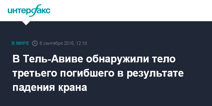 Москва. 6 сентября. INTERFAX.RU - Число погибших в результате падения строительного крана на месте строительства автопарковки в Тель-Авиве достигло трех человек, сообщила в среду израильская газета Haaaretz.
