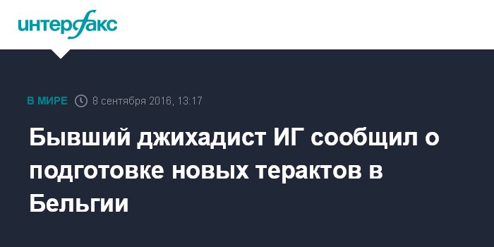 Москва. 8 сентября. INTERFAX.RU - Бывший участник группировки "Исламское государство" (ИГ, запрещена в РФ) заявил о том, что житель бельгийского города Вервье, воюющий в настоящий момент в Ираке, готовит новые теракты в Бельгии, сообщило издание La Derniere Heure.