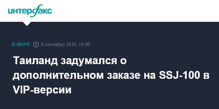 Москва. 8 сентября. INTERFAX.RU - Королевские военно-воздушные силы Таиланда (Royal Thai Air Force, RTAF) могут сделать дополнительный заказ на российские самолеты Sukhoi Business Jet (Sukhoi SuperJet 100 в VIP версии), сообщил "Интерфаксу" источник, близкий к переговорам.