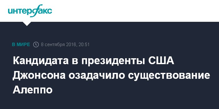 Москва. 8 сентября. INTERFAX.RU - Кандидат в президенты США от Либертарианской партии Гэри Джонсон во время выступления по телевидению заявил, что не знает, что такое Алеппо.