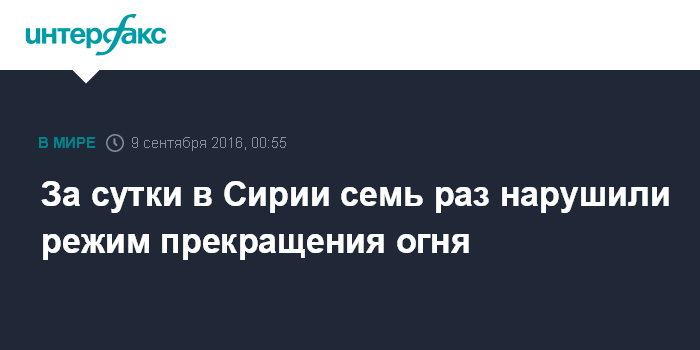 Москва. 9 сентября. INTERFAX.RU - Семь нарушений режима прекращения огня зафиксировано за сутки в Сирии, сообщает Минобороны РФ.