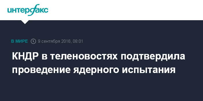 Москва. 9 сентября. INTERFAX.RU - Центральное телевидение КНДР сообщило об осуществлении страной очередного ядерного испытания, передает японская телекомпания NHK. О том, что Пхеньяну удалось осуществить на северо-востоке страны испытание ядерной боеголовки утром 9 сентября, сообщил диктор северокорейского телевидения в выпуске новостей, отмечает NHK.