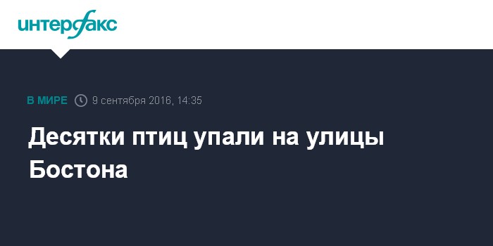 Москва. 9 сентября. INTERFAX.RU - Специалисты в сфере здравоохранения штата Массачусетс выясняют, почему десятки птиц вдруг упали на улицы пригорода Бостона Дорчестер, сообщает Associated Press.