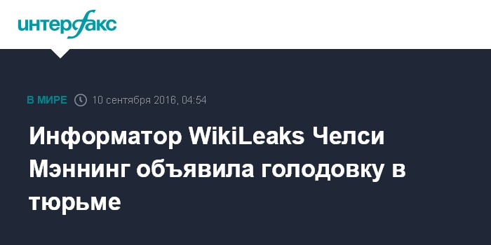 Москва. 10 сентября. INTERFAX.RU - Американка Челси Мэннинг, приговоренная к 35 годам тюрьмы за передачу более 700 тысяч секретных документов сайту WikiLeaks, объявила голодовку.