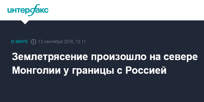 Москва. 12 сентября. INTERFAX.RU - Землетрясение магнитудой 4,5 зафиксировано в северной части Монголии в 407,6 км к юго-востоку от Кызыла (Тува), сообщает Алтае-Саянский филиал Единой Геофизической Службы РАН.
