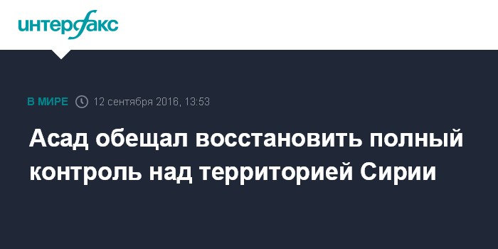 Москва. 12 сентября. INTERFAX.RU - Президент Сирии Башар Асад заявил в понедельник, что намерен восстановить в полном объеме контроль над территорией страны.