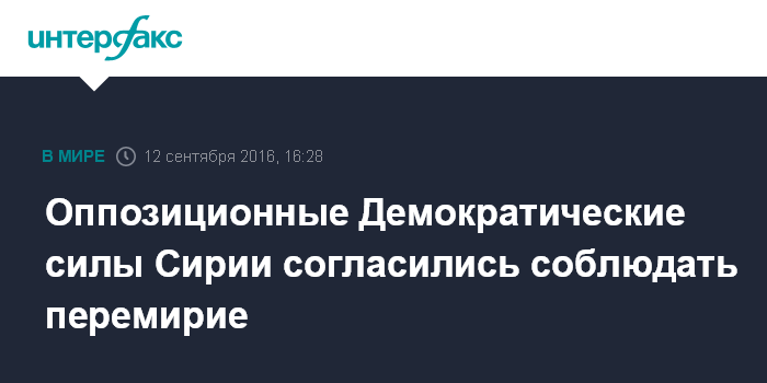 Москва. 12 сентября. INTERFAX.RU - Мятежники из Демократических сил Сирии объявили, что готовы соблюдать перемирие, которое должно вступить в силу позже в понедельник.