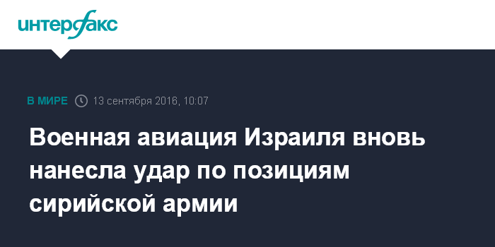 Москва. 13 сентября. INTERFAX.RU - Самолет ВВС Израиля нанес в ночь на вторник удар по позициям сирийской армии, сообщает агентство EFE.