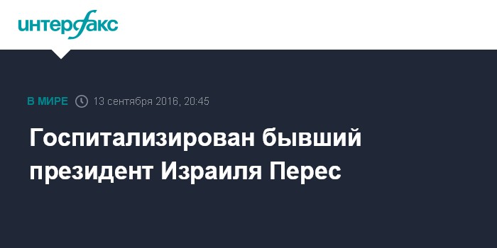 Москва. 13 сентября. INTERFAX.RU - Бывший президент Израиля Шимон Перес во вторник вечером доставлен в больницу, сообщает израильская газета Haaretz.