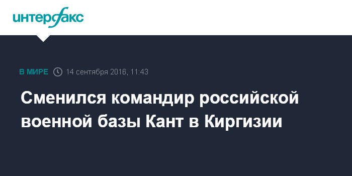 Москва. 14 сентября. INTERFAX.RU - Назначен новый командир объединенной российской военной базы Кант, дислоцированной на территории Киргизии, сообщил помощник командующего войсками Центрального военного округа (ЦВО) Ярослав Рощупкин.