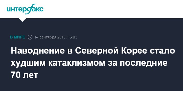 "Наводнение, которое стало последствием тайфуна и обрушилось на провинцию Хамгён-Пукто в период с 29 августа по 2 сентября, стало худшим катаклизмом с момента освобождения от японской оккупации в 1945 году", - говорится в сообщении.