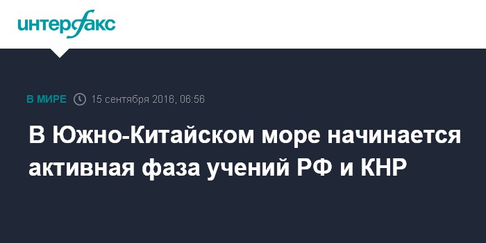 Москва. 15 сентября. INTERFAX.RU - Активная фаза российско-китайских маневров "Морское взаимодействие-2016" пройдет 15-19 сентября.