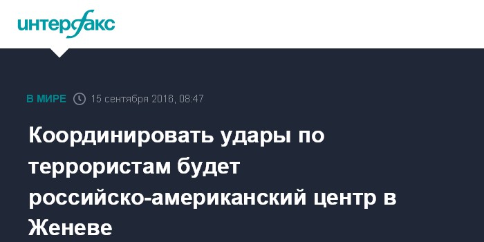 Москва. 15 сентября. INTERFAX.RU - Российско-американский исполнительный центр, призванный координировать удары по террористам, заработает на днях в Женеве. Военные эксперты обеих стран должны согласовать, по каким террористическим группировкам будут нанесены совместные авиаудары, заявил замглавы МИД РФ Геннадий Гатилов.
