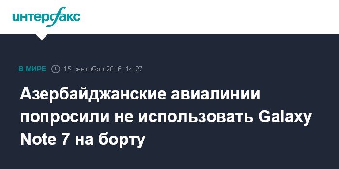 Москва. 15 сентября. INTERFAX.RU - ЗАО "Азербайджанские авиалинии" (AZAL) призвало пассажиров не использовать во время полетов смартфоны Samsung Galaxy Note 7, говорится в сообщении компании.
