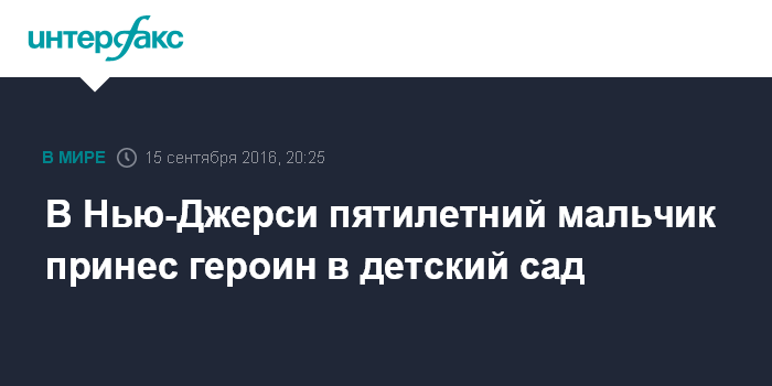 Москва. 15 сентября. INTERFAX.RU - Полиция города Трентон в американском штате Нью-Джерси начала расследование инцидента, который произошел в одном из детских садов. Как сообщает Fox News, пятилетний мальчик принес из дома 30 пакетиков героина.