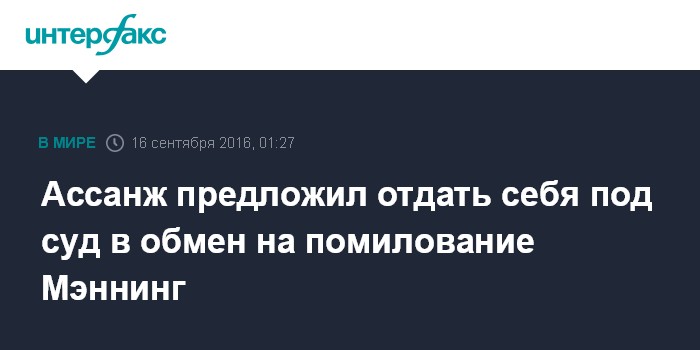 Москва. 16 сентября. INTERFAX.RU - Основатель сайта WikiLeaks Джулиан Ассанж предложил отдать себя под суд в США в обмен на помилование для бывшего американского офицера Челси Мэннинг, отбывающую наказание за разглашение секретной информации.