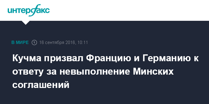 Москва. 16 сентября. INTERFAX.RU - Представитель Украины в Трехсторонней контактной группе по урегулированию ситуации в Донбассе, второй президент Украины Леонид Кучма считает, что Германия и Франция, как члены "Нормандской четверки", должны взять на себя ответственность за невыполнение Минских соглашений.
