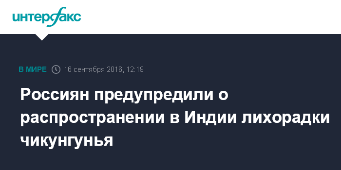 Москва. 16 сентября. INTERFAX.RU - Роспотребнадзор предупреждает об ухудшении эпидемиологической ситуации в Индии в связи с распространением геморрагической лихорадки чикунгунья и просит россиян соблюдать меры предосторожности при посещении этой страны.