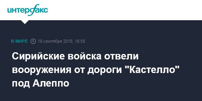 Москва. 16 сентября. INTERFAX.RU - Правительственные войска Сирии отвели вооружения от дороги "Кастелло" под Алеппо для создания демилитаризованной зоны, аналогичных действий со стороны подконтрольных США отрядов оппозиции не наблюдается. Об этом сообщил первый заместитель начальника главного оперативного управления Генштаба ВС РФ генерал-лейтенант Виктор Познихир.