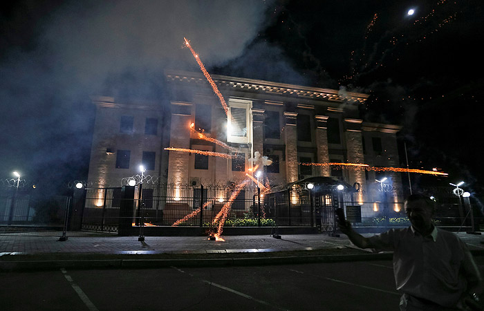 Ранее в субботу в посольстве России в Украине заявили, что ночью группа неизвестных бросила на территорию посольства дымовую шашку и применила салютную установку.