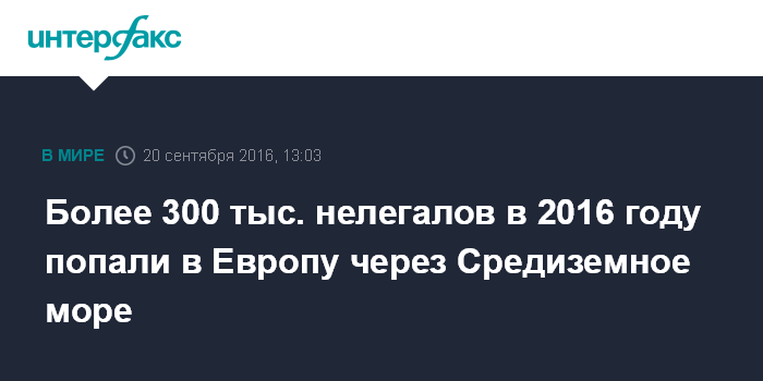 Москва. 20 сентября. INTERFAX.RU - Более 300 тысяч нелегальных иммигрантов добрались в 2016 году до Европы по Средиземному морю, сообщили во вторник в ООН.
