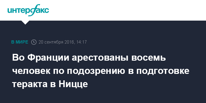 Москва. 20 сентября. INTERFAX.RU - Французские власти арестовали восемь человек в связи с терактом в Ницце в День взятия Бастилии, сообщает во вторник агентство AP.