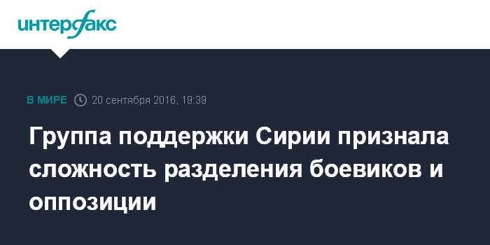 Москва. 20 сентября. INTERFAX.RU - Участники заседания Международной группы поддержки Сирии (МГПС) признали сложности отделения умеренной сирийской оппозиции от террористической группировки "ан-Нусра" , сообщил официальный представитель Госдепартамента США Джон Кирби.