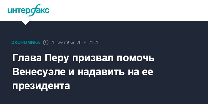 Москва. 20 сентября. INTERFAX.RU - Президент Перу Пабло Кучински призвал своих южноамериканских коллег помочь Венесуэле и в то же время оказать давление на ее президента Николаса Мадуро. Об этом он заявил в интервью Bloomberg в ходе визита в США. Венесуэла длительное время находится на грани экономического коллапса. Оппозиционеры возлагают ответственность за упадок в экономике на проводимую социалистами политику, в частности на президента Мадуро - преемника покойного президента Уго Чавеса.