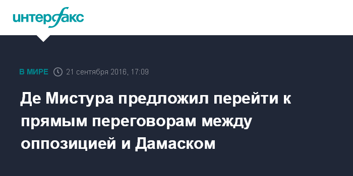 Москва. 21 сентября. INTERFAX.RU - Спецпосланник ООН по Сирии Стаффан де Мистура подготовил рамочный план по возобновлению межсирийских переговоров и готов представить его Международной группе поддержки Сирии (МГПС).