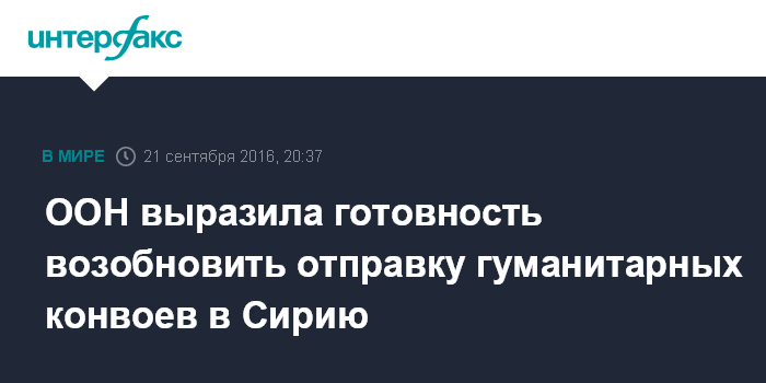 Москва. 21 сентября. INTERFAX.RU - В ООН в среду сообщили, что готовы возобновить отправку гуманитарных конвоев в Сирию после приостановки их передвижения из-за атаки на конвой под Алеппо.