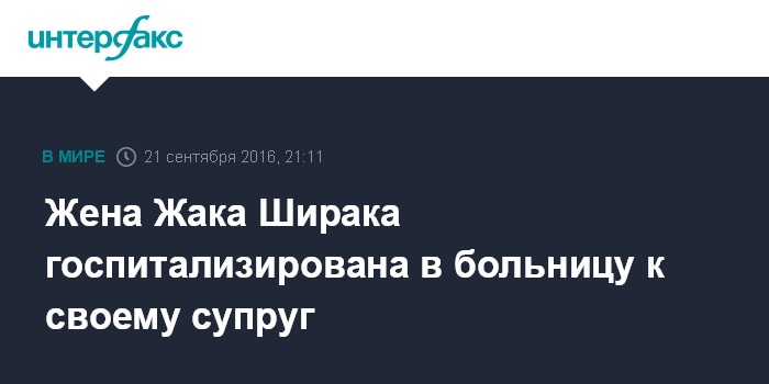 Москва. 21 сентября. INTERFAX.RU - Супруга бывшего президента Франции Жака Ширака Бернадетт госпитализирована в Париже, сообщили в среду местные СМИ.