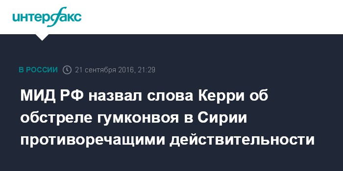 Москва. 21 сентября. INTERFAX.RU - Официальный представитель МИД РФ Мария Захарова заявила, что аргументы, изложенные госсекретарем США Джоном Керри относительно обстрела гуманитарного конвоя в Сирии, не соответствовали действительности.