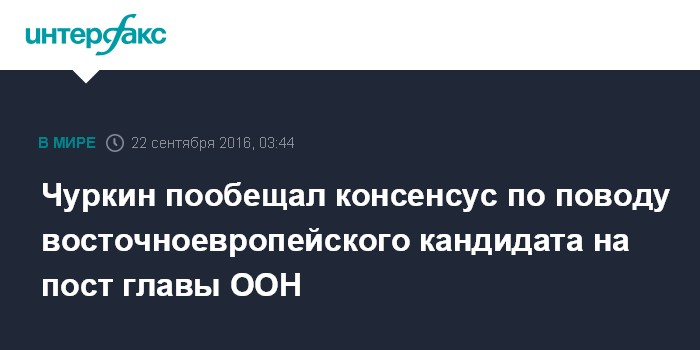 Москва. 22 сентября. INTERFAX.RU - Постпред России в Организации объединенных наций Виталий Чуркин пообещал, что в скором времени будет достигнут консенсус по кандидату на пост главы организации от Восточной Европы или другой европейской субрегиональной группы.